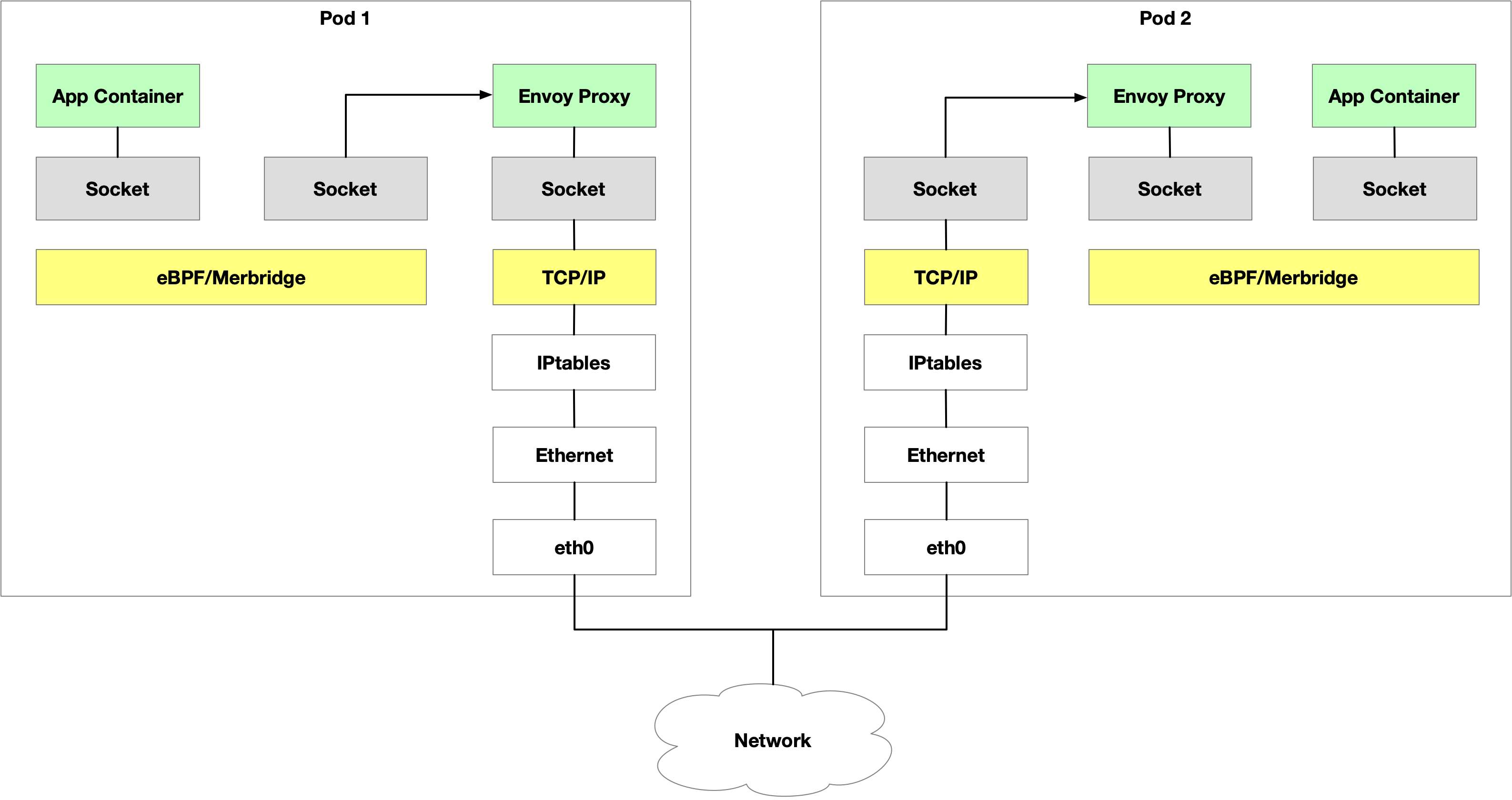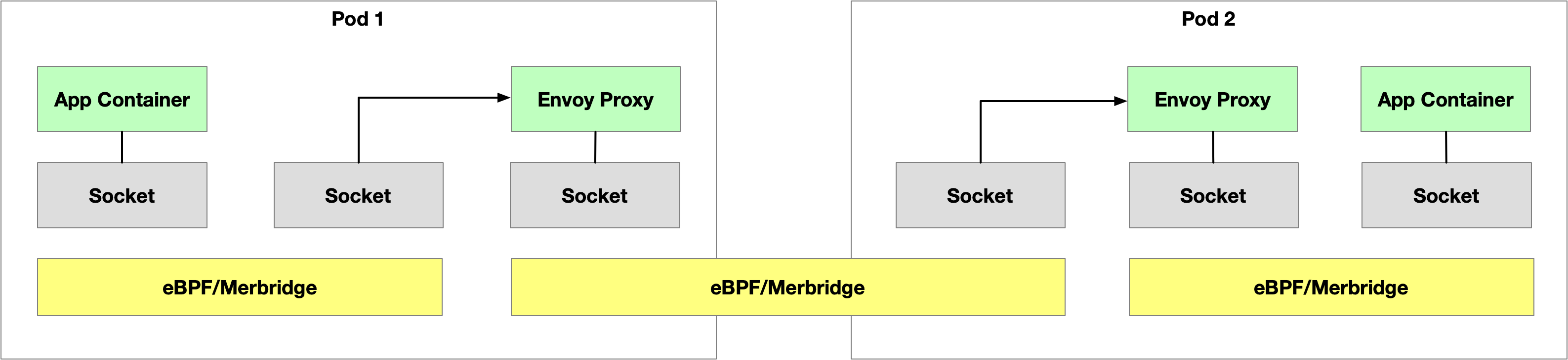 如果两个 Pod 位于同一台主机,那么流量转发全程都可以通过 Merbridge 完成。下图展示了的是在同一主机上使用 Merbridge 的示意图。