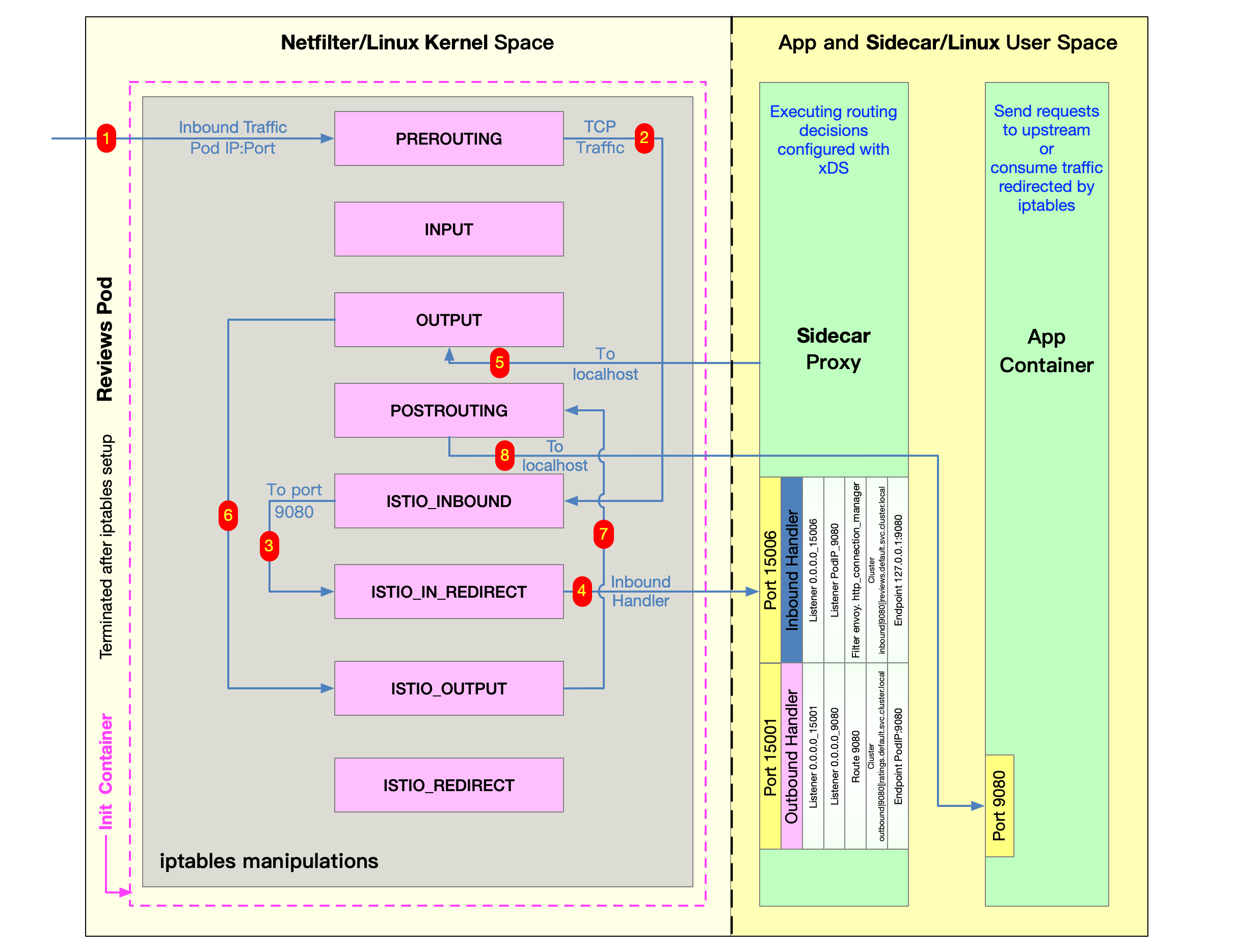 在 Istio 中的 Sidecar 注入与流量劫持详解中,我们谈到 Istio 默认使用 IPtables 拦截数据平面中的流量到 Envoy 代理,这种拦截方式通用性最强。因为 Pod 中所有的 inbound 和 outbound 流量都会先通过 Envoy 代理,尤其是 Pod 接收的流量,都要先通过 IPtables 将流量劫持到 Envoy 代理后再发往 Pod 中的应用容器的端口。