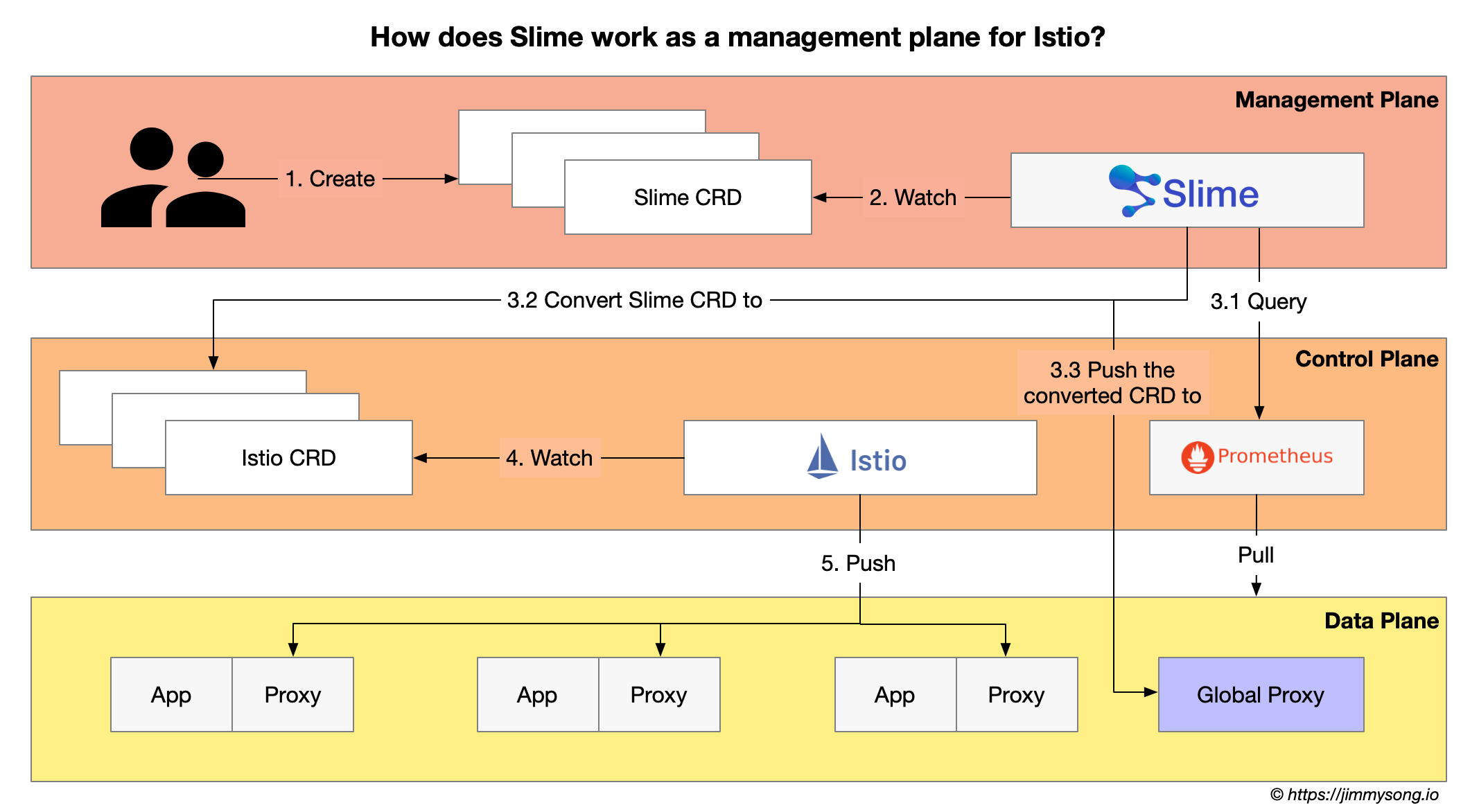 - Slime 查询 Prometheus 中保存的相关服务的监控数据,结合 Slime CRD 中自适应部分的配置,将 Slime CRD 转换为 Istio CRD,同时将其推送到 Global Proxy 中;