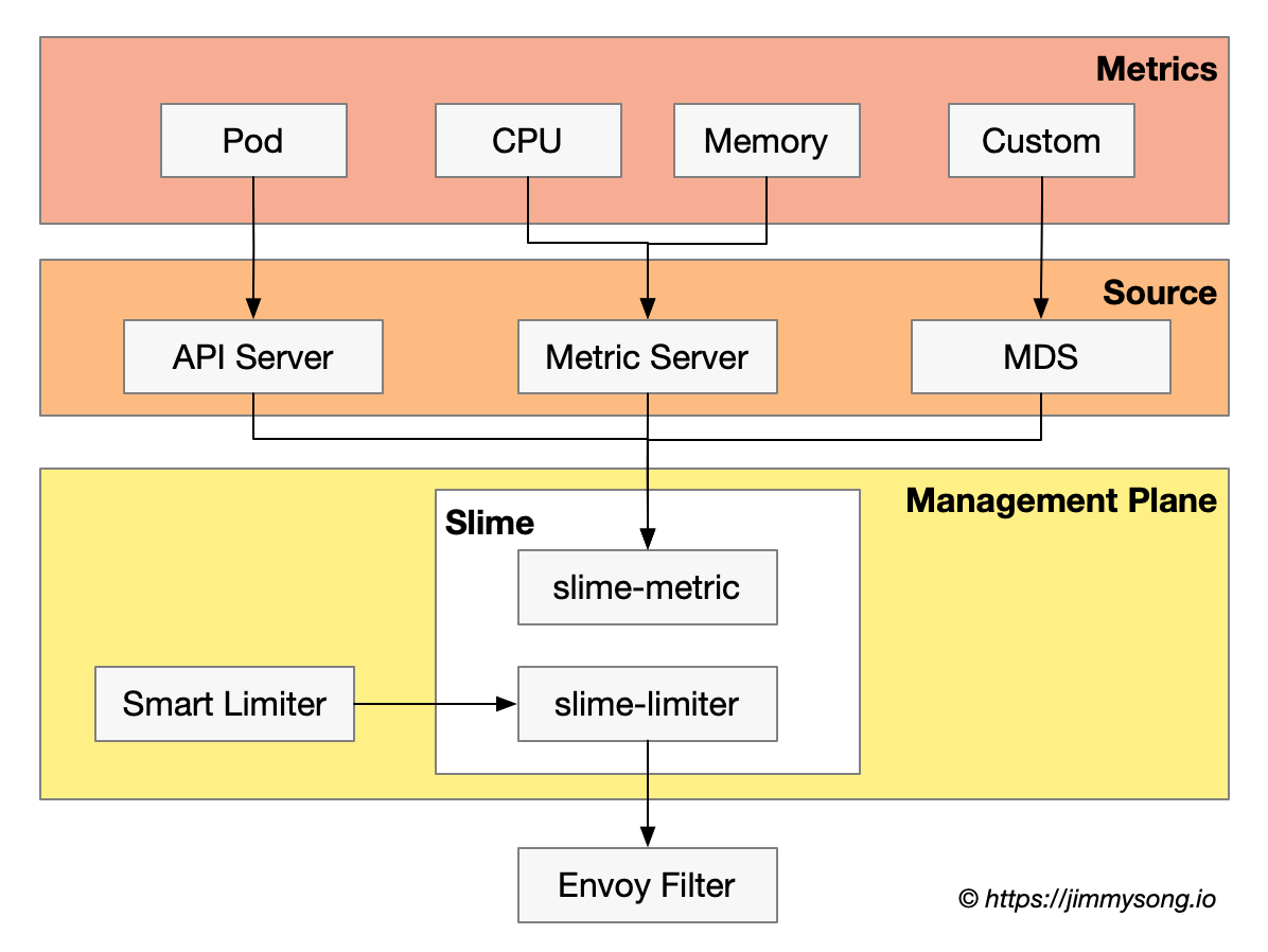 Envoy 内置的限流组件功能单一,只能以实例维度配置限流值,无法做到根据应用负载的自适应限流。Slime 通过与 Prometheus metric server 对接,实时的获取监控情况,来动态配置限流值。