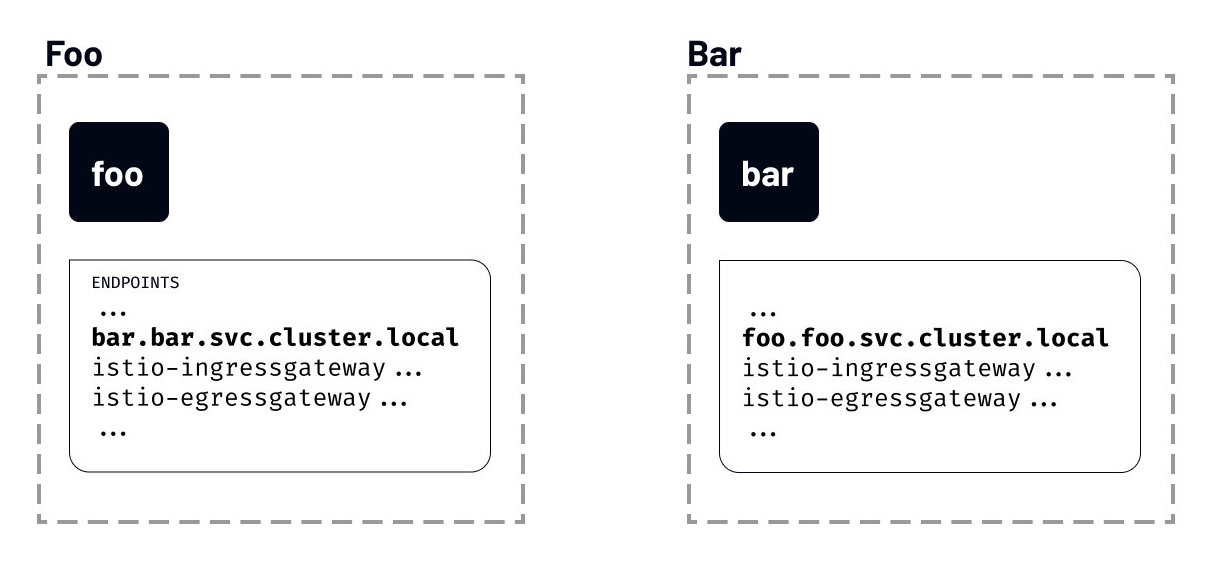 例如,我们在不同的命名空间部署了两个工作负载——foo 和 bar。尽管我们知道 foo 永远不会与 bar 通信,反之亦然,但一个服务的端点将被包含在另一个服务的已发现端点列表中。