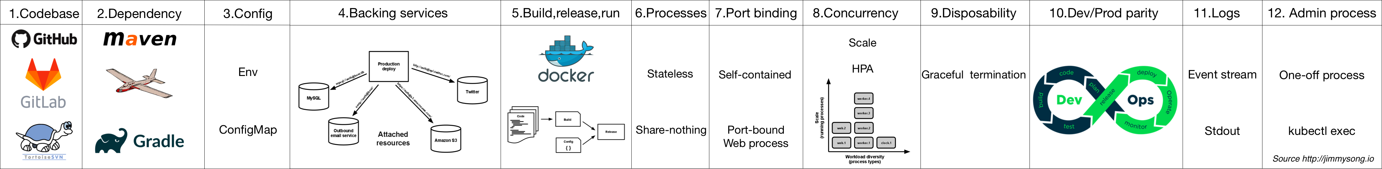 大家不要孤立的来看这每一个因素,将其与自己软件开发流程联系起来,这 12 个因素大致就是按照软件从开发到交付的流程顺序来写的。