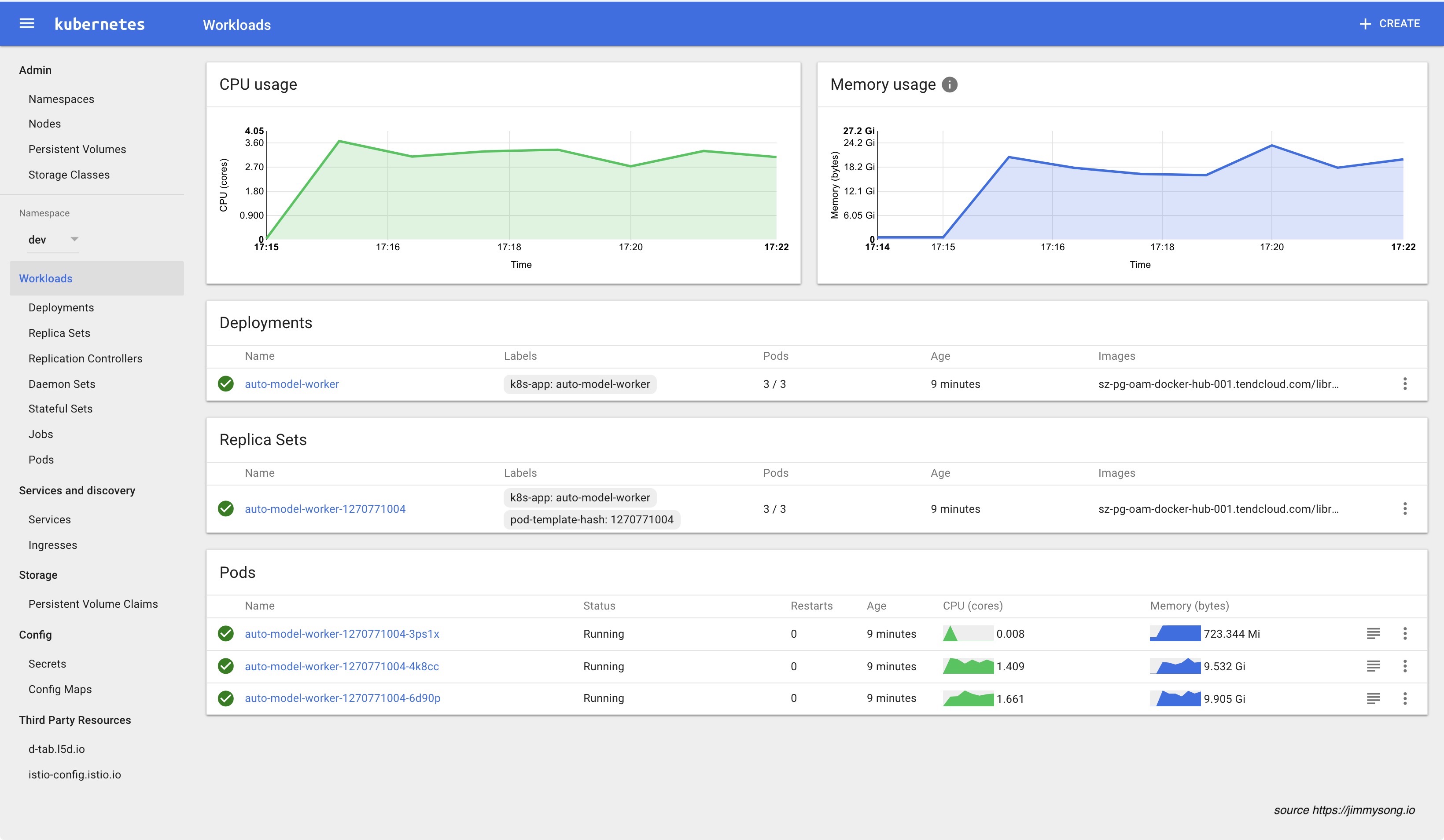下图是从 Kubernetes dashboard 上看到的 spark-cluster 这个 namespace 上运行的应用情况。