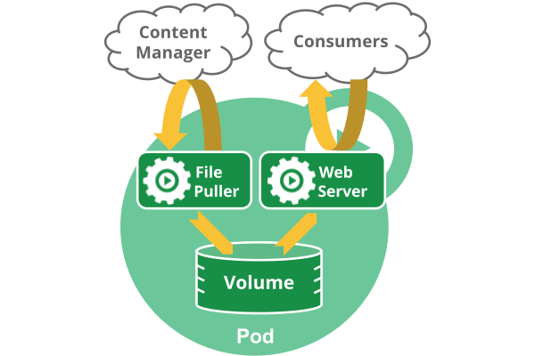 说明:一个多容器 Pod,包含文件提取程序和 Web 服务器,该服务器使用持久卷在容器之间共享存储。 s