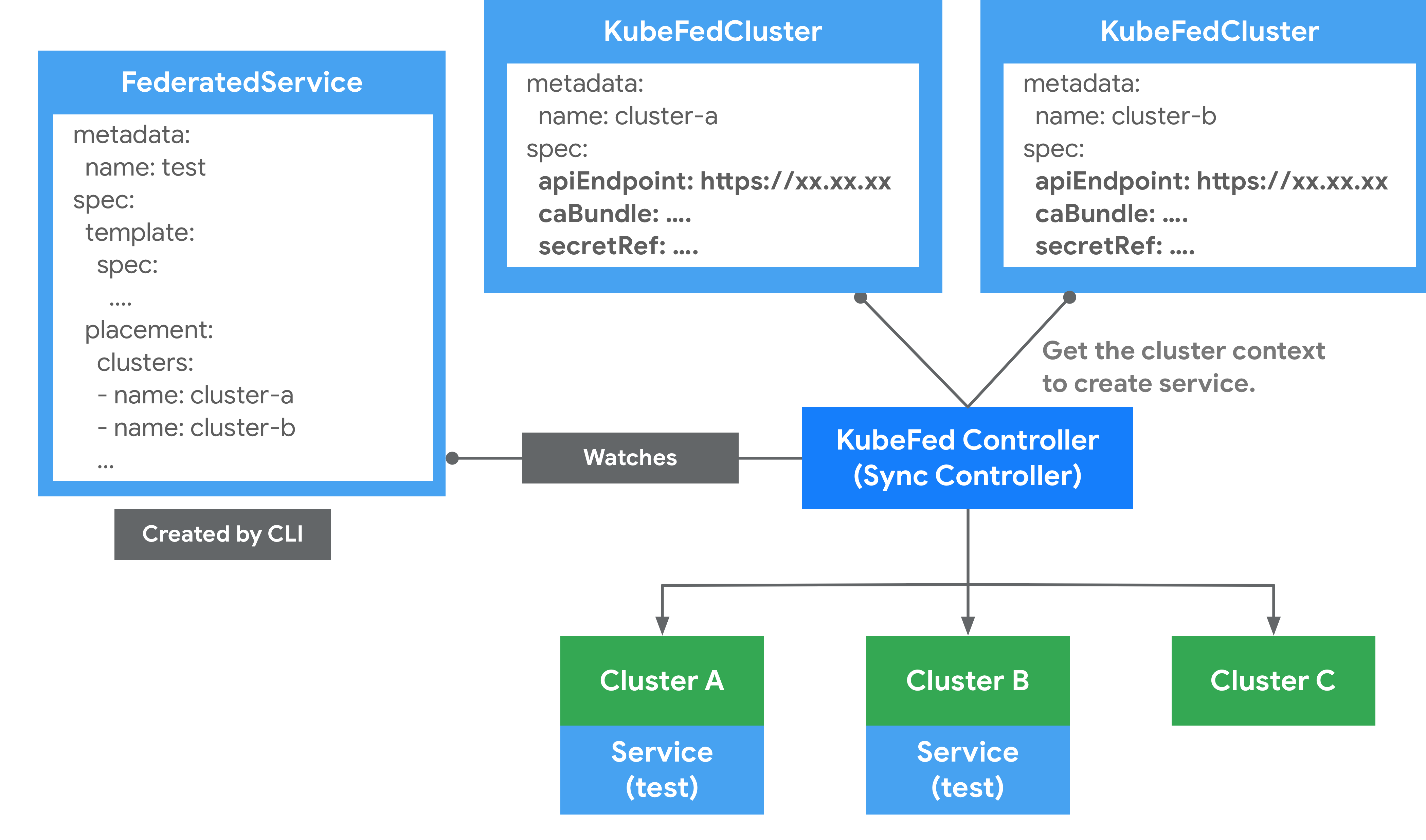 Federated Service 的核心是包含一个 Template(Kubernetes服务的定义)、一个 Placement(部署到哪个集群)、一个 Override(在特定集群中的可选变化)和一个 ServiceDNSRecord(指定如何发现它的细节)。