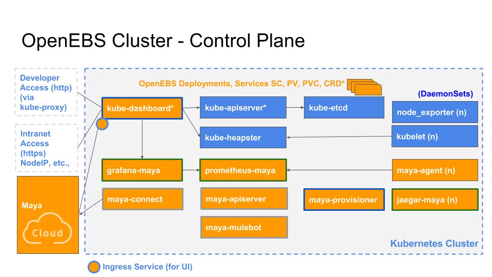 maya-apiserver、maya-agent、maya-mulebot、maya-connect、mayactl等等。 - openebs-dashboard:kubernetes-dashboard 项目的分支,扩展了存储功能。