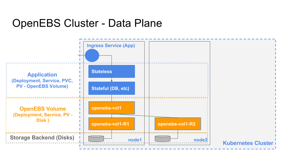- 控制平面:管理 OpenEBS 卷容器,这通常会用到容器编排软件的功能