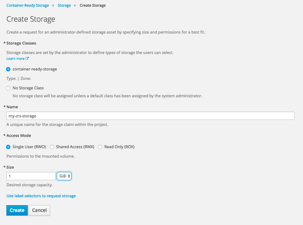 或者,你也可以使用 OpenShift UI 来配置存储,这样可以很方便地在系统中的所有已知的 StorageClasses 中进行选择: