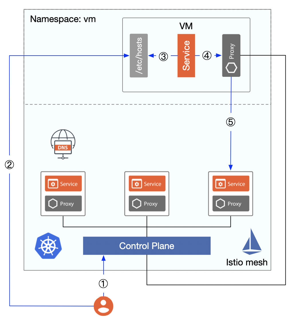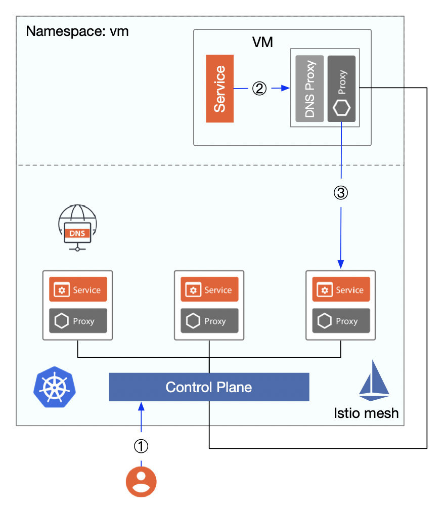 - (可选)虚拟机可以访问到 Mesh 内部的(部署在 Kubernetes 中)的 DNS server。