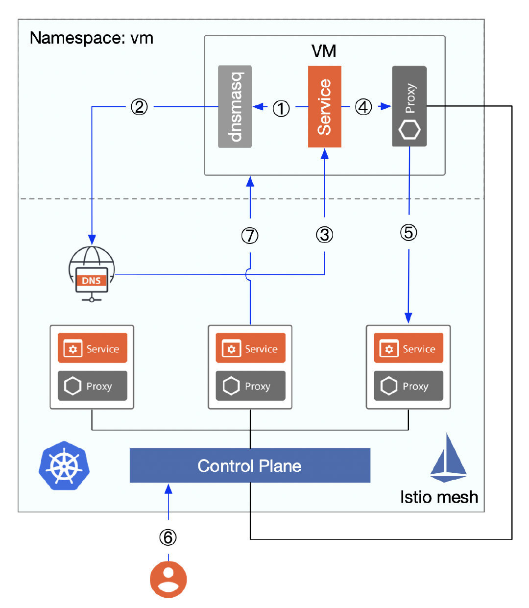 - (可选)在虚拟机中安装、配置并启动 Istio 的组件、dnsmaq(用于DNS 发现),此时虚拟机可以使用 FQDN 访问 mesh 中的服务了,这一步是为了保证虚拟机可以正确解析出 mesh 中服务的 Cluster IP;