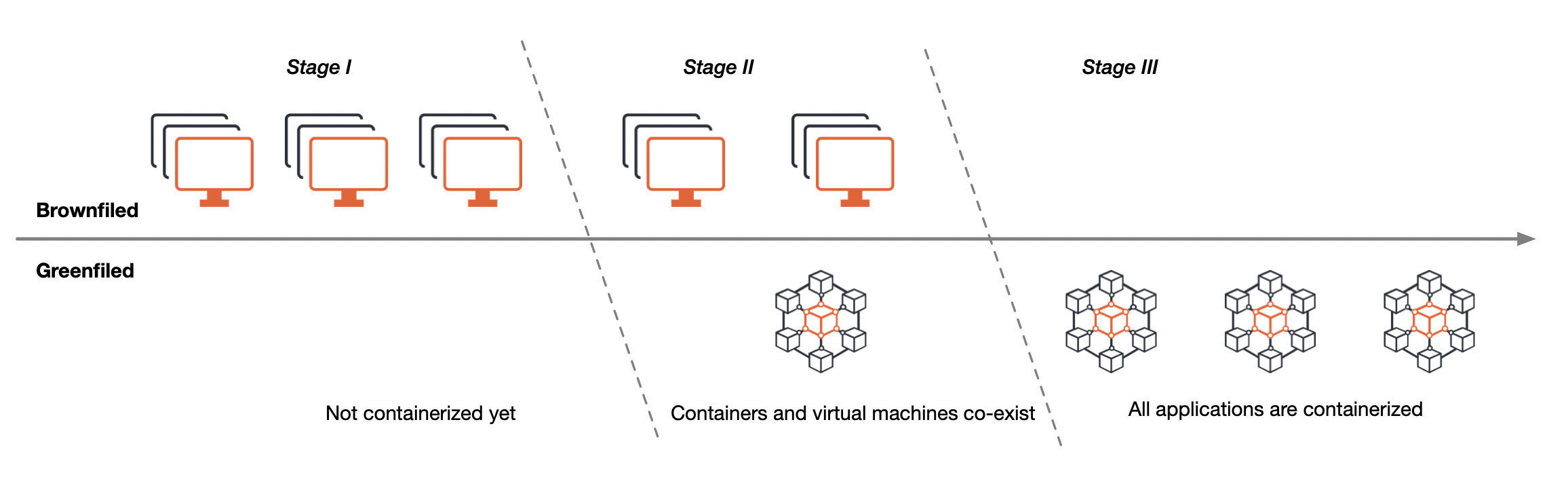 在我们将应用在迁移到云原生架构,不断容器化的过程中,将经历三个阶段,如下图所示。