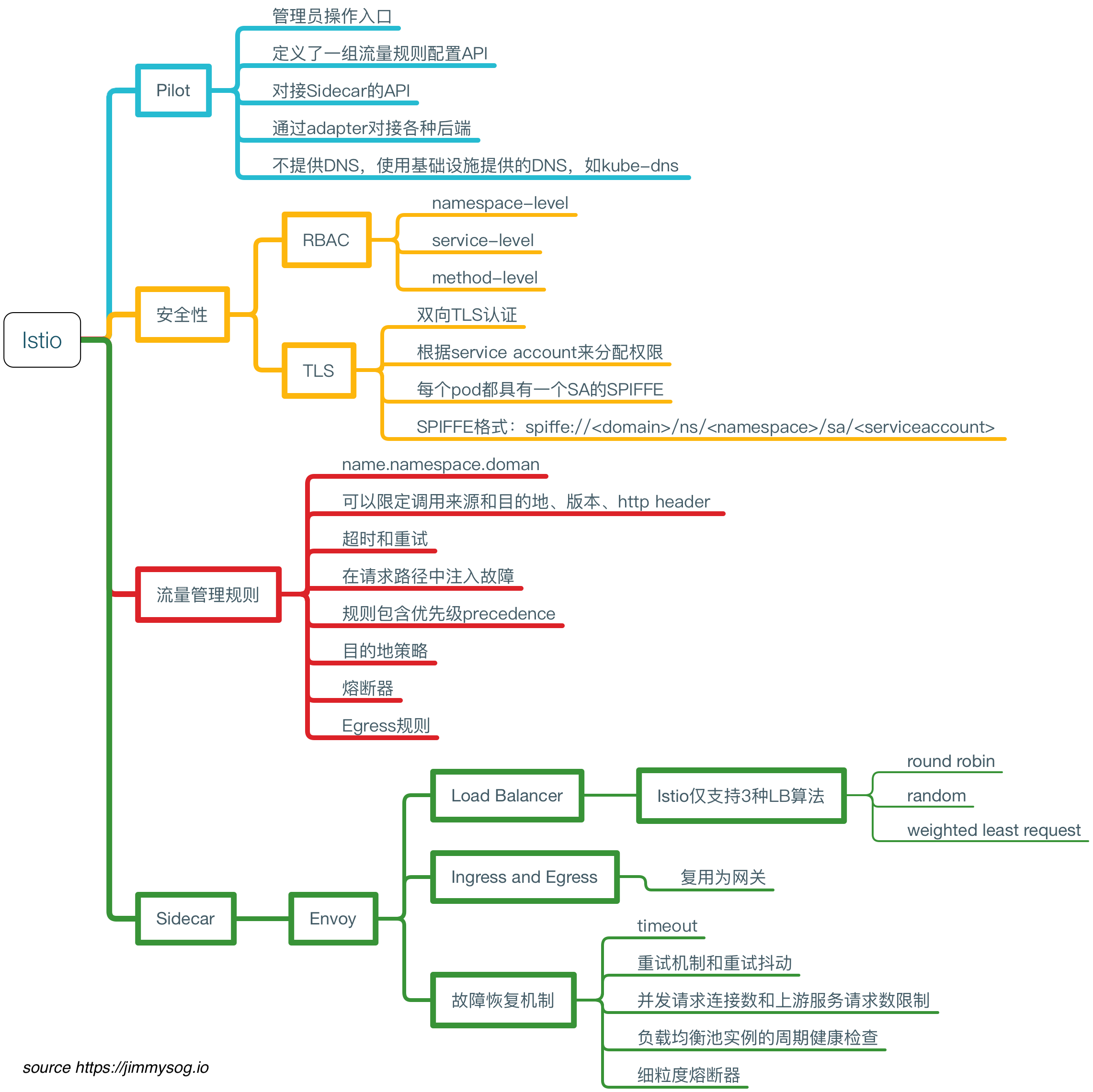 关于Istio中的各个组件和一些关键信息请参考下面的mindmap。